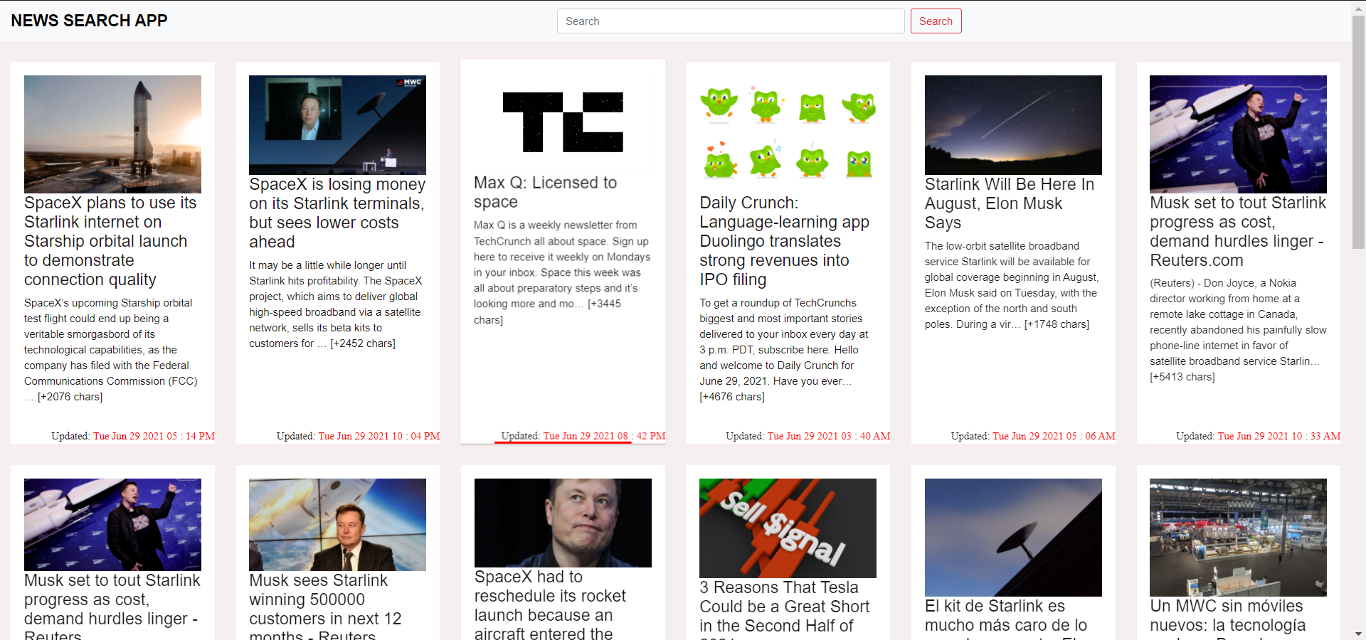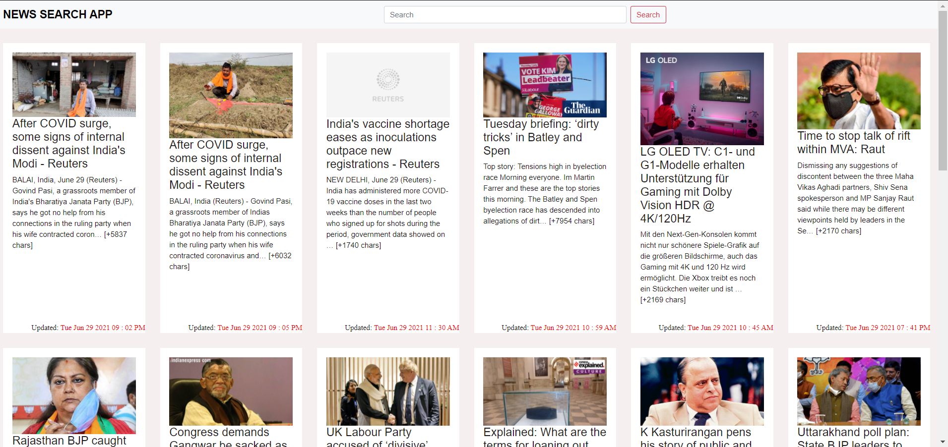 A web app developed using Express, EJS, Node JS and JavaScript. The API used to Extract the news is News API . The model work perfectly for Search Purposes. The next work is add some more functionalities using API.