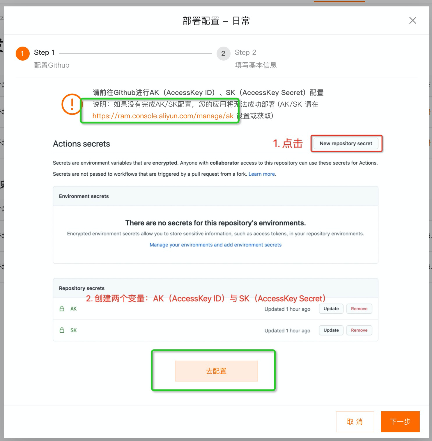 如果您是第一次在该仓库上使用云开发平台,需要将 https://ram.console.aliyun.com/manage/ak 中的AccessKeyID、AccessKeySecret,粘贴配置到GitHub Secret中的AK、SK变量中。具体步骤,请仔细阅读「部署配置」的Step1。