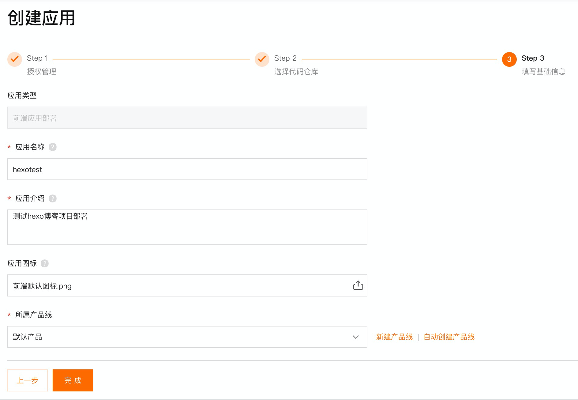 点击「下一步」、「完成」。稍等片刻创建成功后,将进入到应用部署界面。