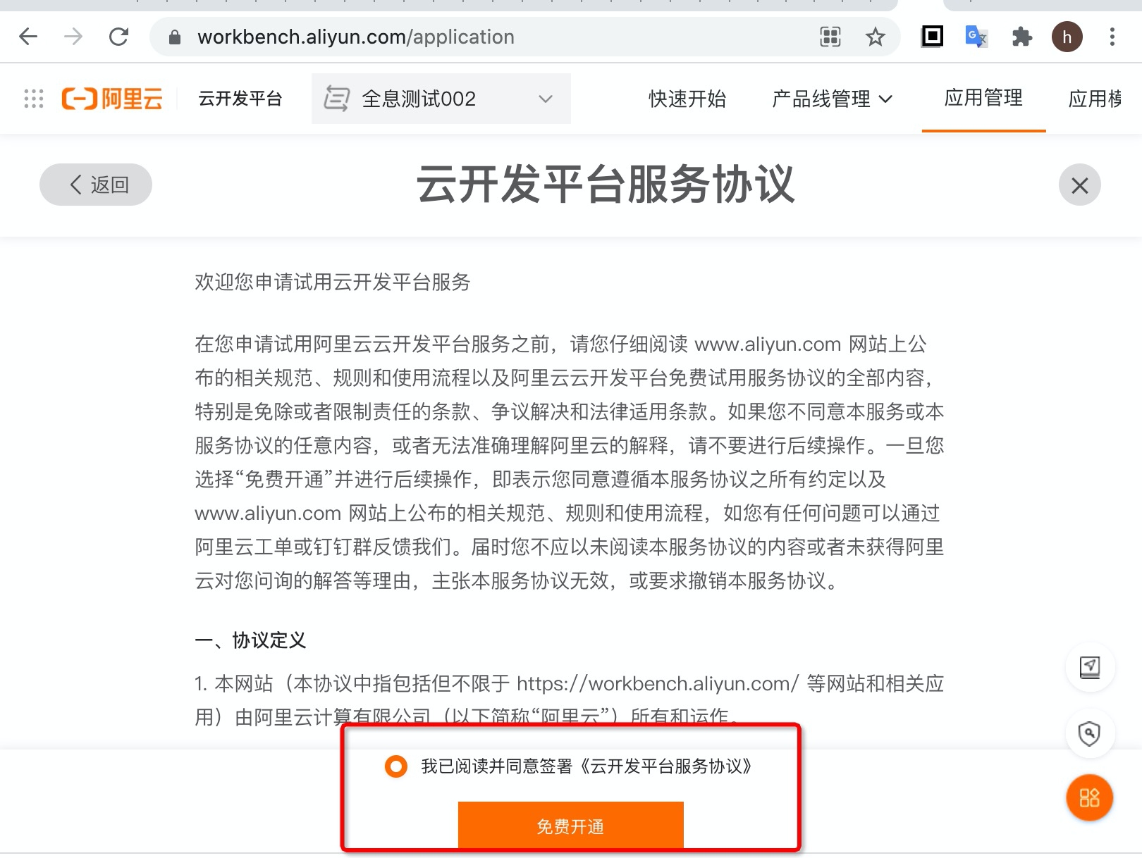 2.打开云开发平台,完成阿里云账号注册登陆,同意云开发平台服务协议 https://workbench.aliyun.com/application