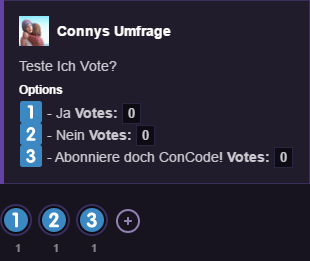 s!vote -c Teste Ich Vote?~Ja~Nein~Abonniere doch ConCode! |