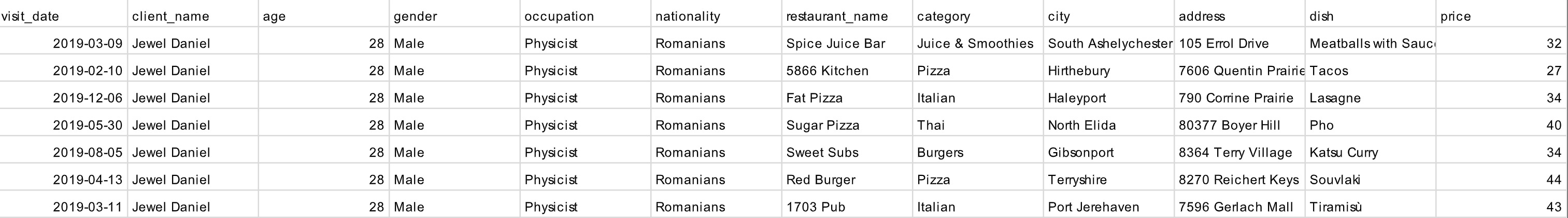 đź’ˇ On December 06, 2019, Jewel Daniel, a physicist Romanian man, 28 years old, visited "Fat Pizza", an "Italian" restaurant located in Haleyport city (790 Corrine Prairie), and ordered a Lasagna which cost him $34.As the developer/analyst team of Insights, your job is to transform this raw data into a clean and manageable relational database and answer the deep questions the research team have come up with.