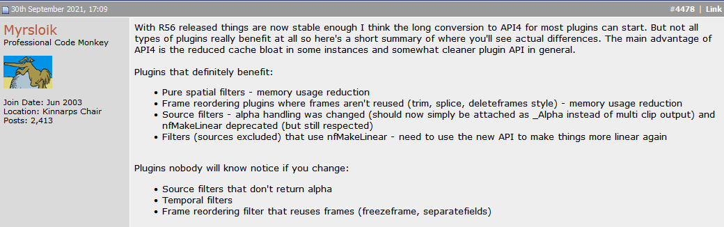 VapourSynth got a big API change in R55 which broke compatibility with many plugins.