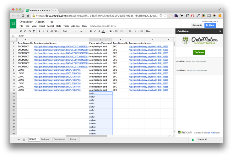 OntoMaton facilitates ontology search and tagging functionalities within Google Spreadsheets. It has been developed by the ISA Team at the University of Oxford's e-Research Centre.