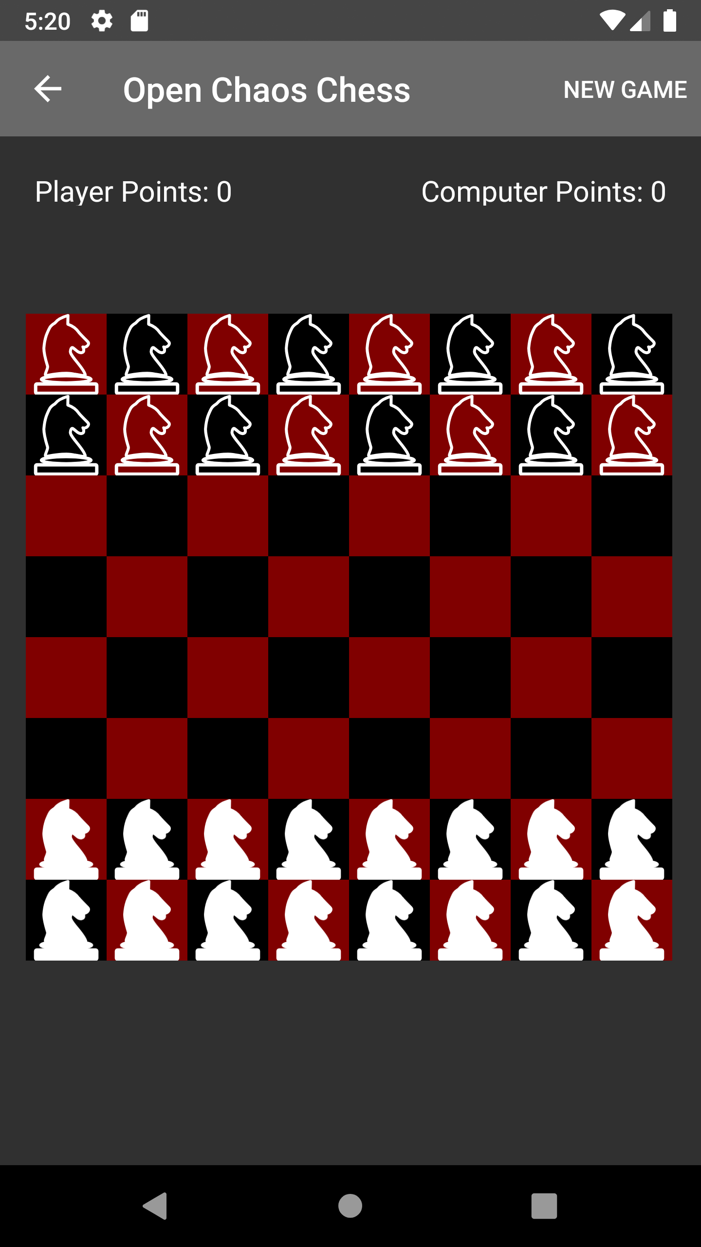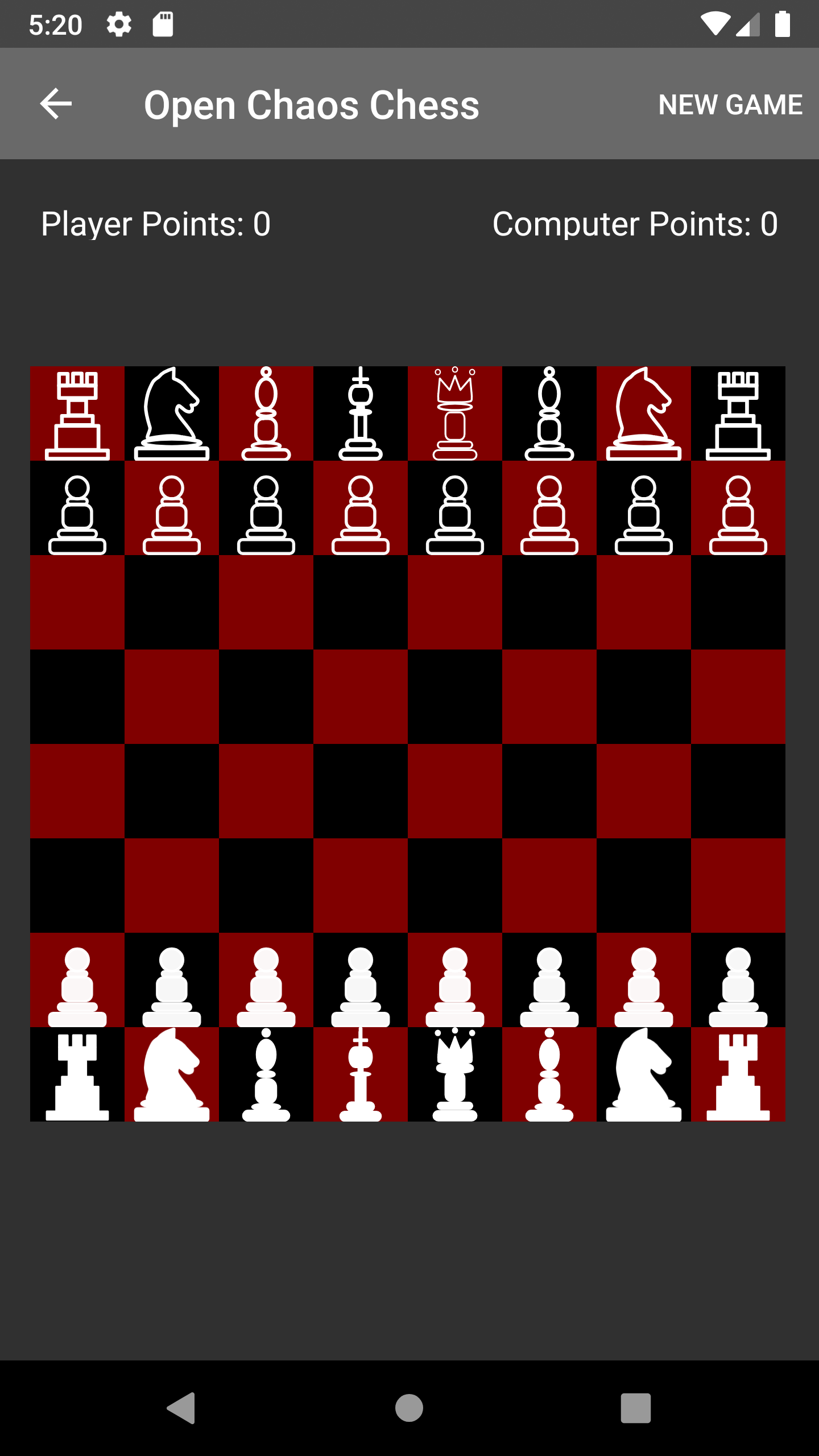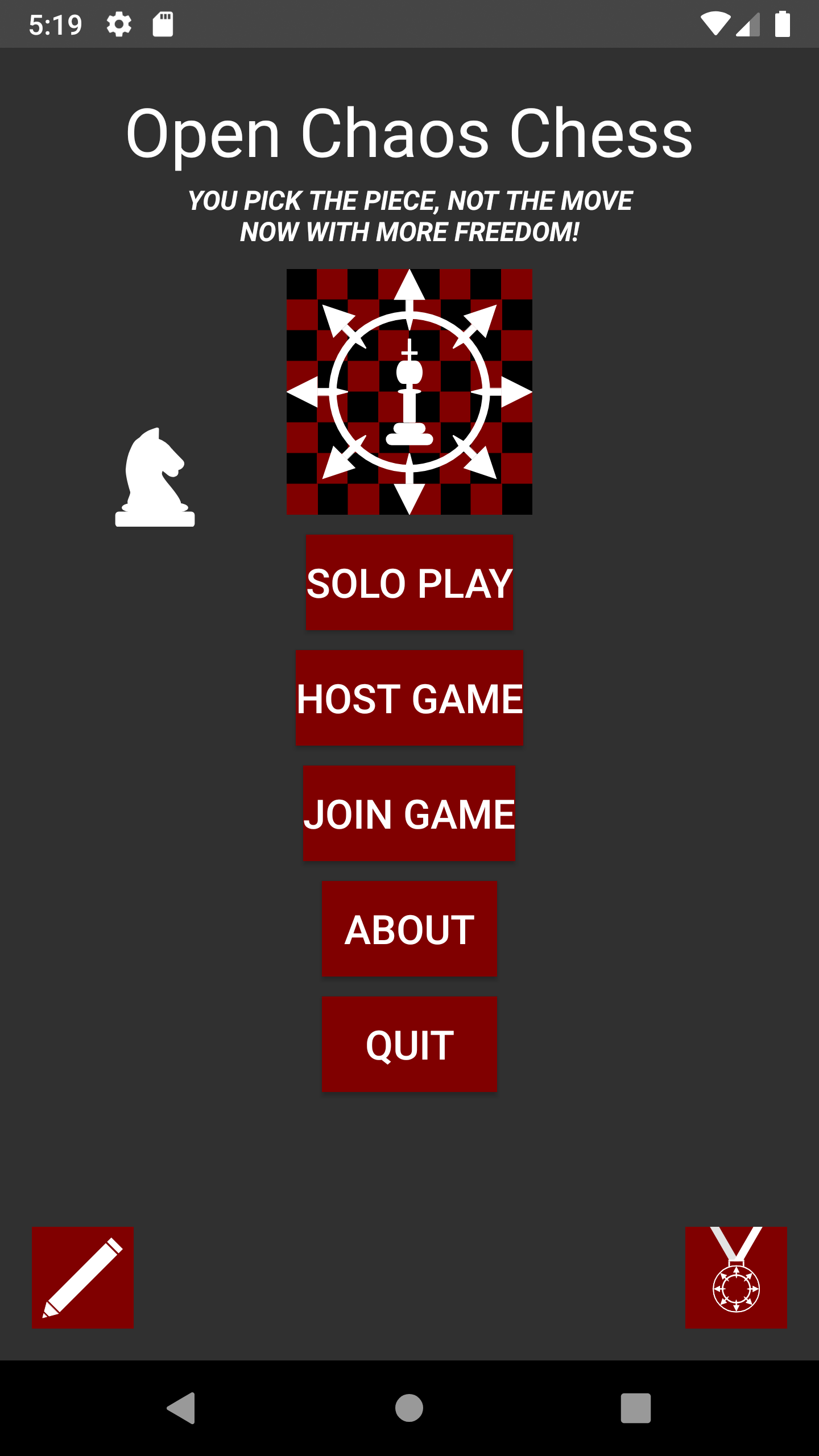 Open Chaos Chess is a free and open source version of Chaos Chess, stripped of Google Play Services. Chaos Chess is a variation of chess where you can pick the piece that moves, but the moves are random. As such, you no longer win by checkmates. Instead, you win by eliminating your opponent's pieces. Have fun, and may the RNG be ever in your favor.