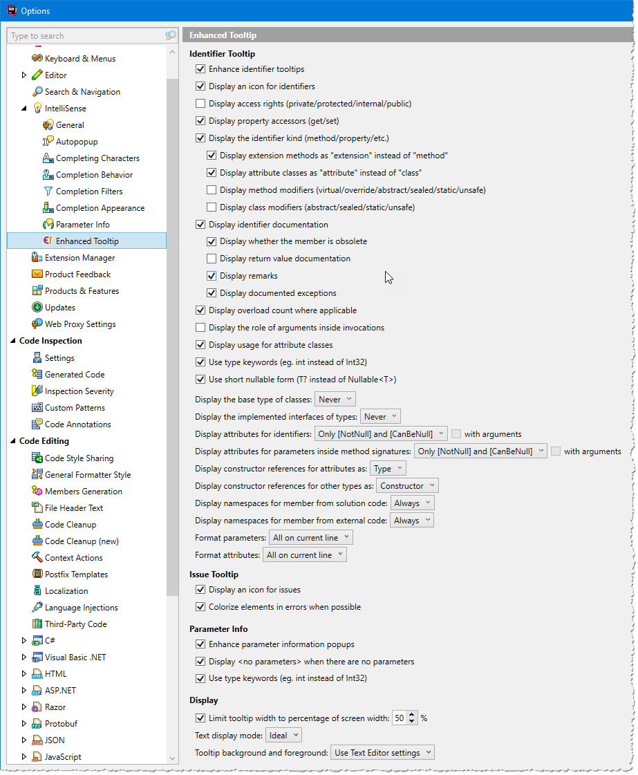 The options page is located at ReSharper → Options → Environment → IntelliSense → Enhanced Tooltip.