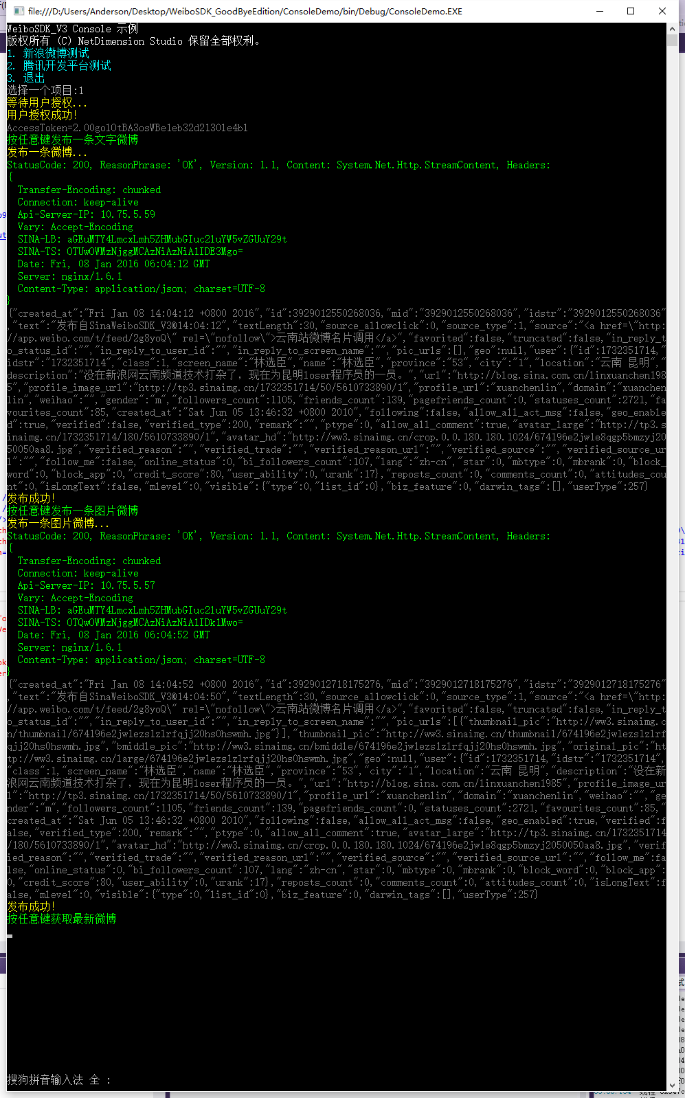 - 由于新浪的限制,第三版SDK不再提供模拟登录接口,Winform或者控制台项目请引用NetDimension.OpenAuth.Winform库,里面封装了一个授权窗口,具体请看示例。