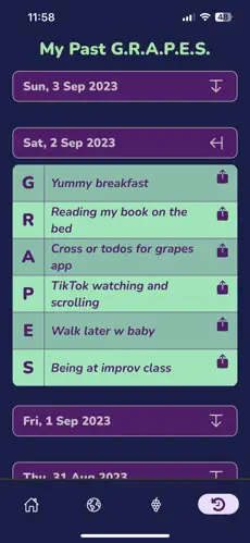 Grapes-App is a mobile app for mental health and wellness; a pocket-size version of the GRAPES© practice. It is a tool to help you practice GRAPES© daily, and also a tool to help you track your progress and see your growth over time. You can keep track every day of your planned activities. You can share the activities you have done with others. You can also see what others have done and get ideas for your own GRAPES© practice in the Global Feed.