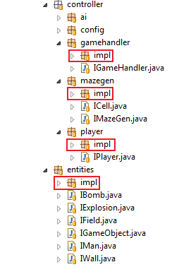 After the Dependency Injection pattern was introduced, the project needed a complete redesign. Every access should only happen through interfaces. The direct implemntation should be invisible for the using classes. The implemented classes should lie in an extra package 'impl'.