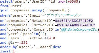 and`companies`.`CompanyID`in(@@AdminCompanyIDs) and yeet.poop   in('') and`users`.`__Active`<>0.0 and @i := -.232 order by`users`.`__Added`desc limit 1;Well that will spit back out something that looks like this