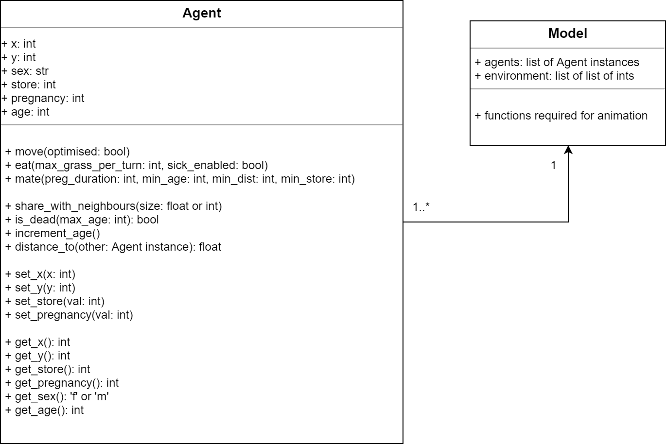 - Sexes and Reproduction - female sheep (white) can be impregnated by male sheep (black) if both sheep have sufficient store (default 50), are close enough (default within 20), and are of fertility age (adjustable in GUI, default 20)