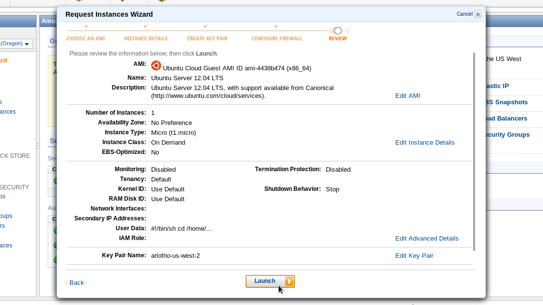 If you haven't yet, create a new Key Pair and download it. You will need it to access the instance if it fails, and to update its software.