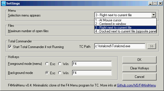 A minimalistic clone of the F4Menu program for Total Commander (open selected files in editor(s)) just offering the basic functionality. Original F4Menu program by Shao Shanny - www.shanny.com.cn (website seems to be offline, see TC forum links below)