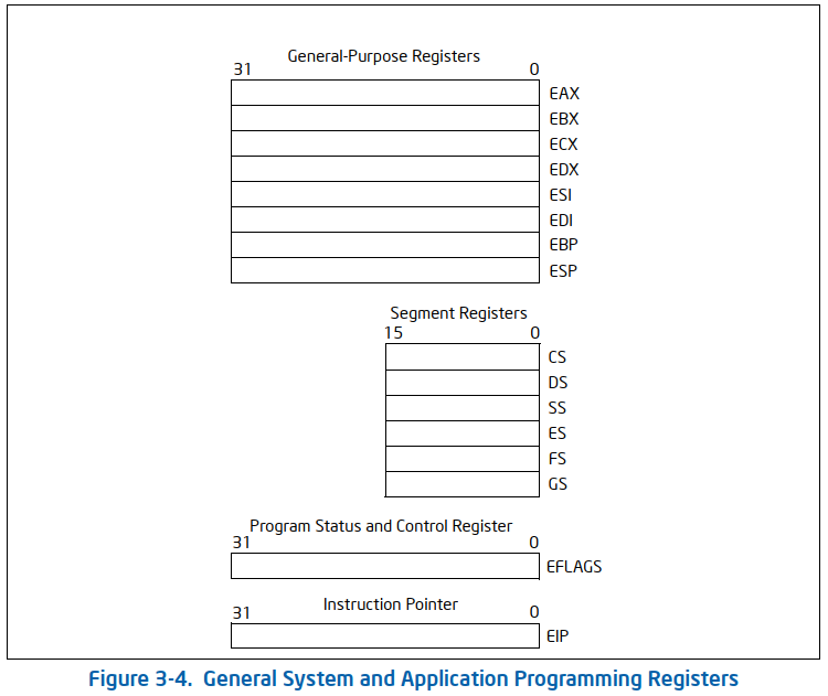 - EFLAGS (program status and control) register: report on the status of the program being executed and allows limited (application-program level) control of the processor.