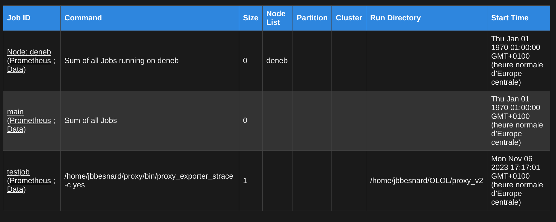 A prometheus export for each job http://localhost:1337/metrics/?job=testjob. Note http://localhost:1337/metrics is the export of the main job and thus equivalent to http://localhost:1337/metrics/?job=main