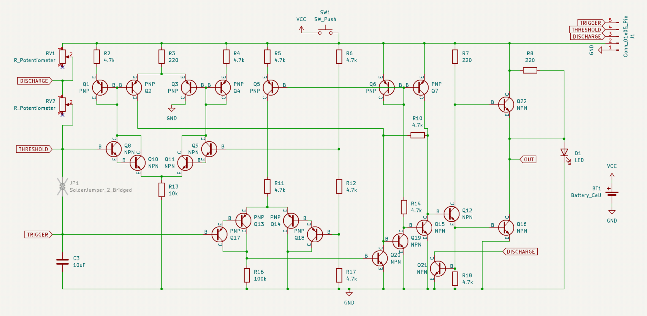 Ever wondered how a 555 timer IC worked? Here you have it! A 555 IC, made entirely with THT transistors.