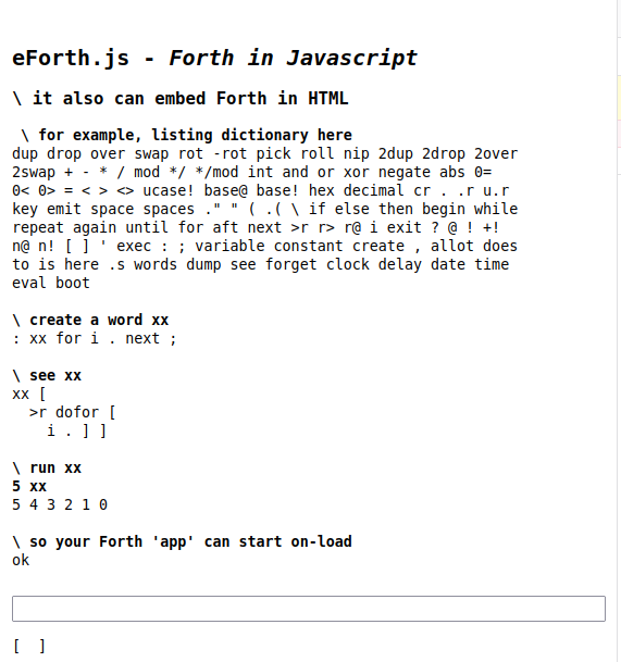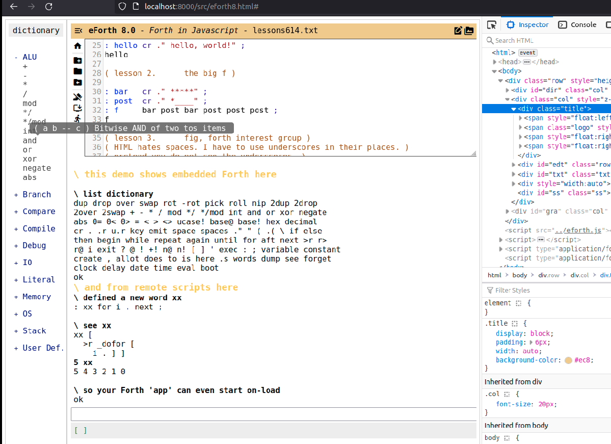 Note if you kick-off the eforth8.html page from a webserver (as described below), the embedded Forth in the page also can be executed.
