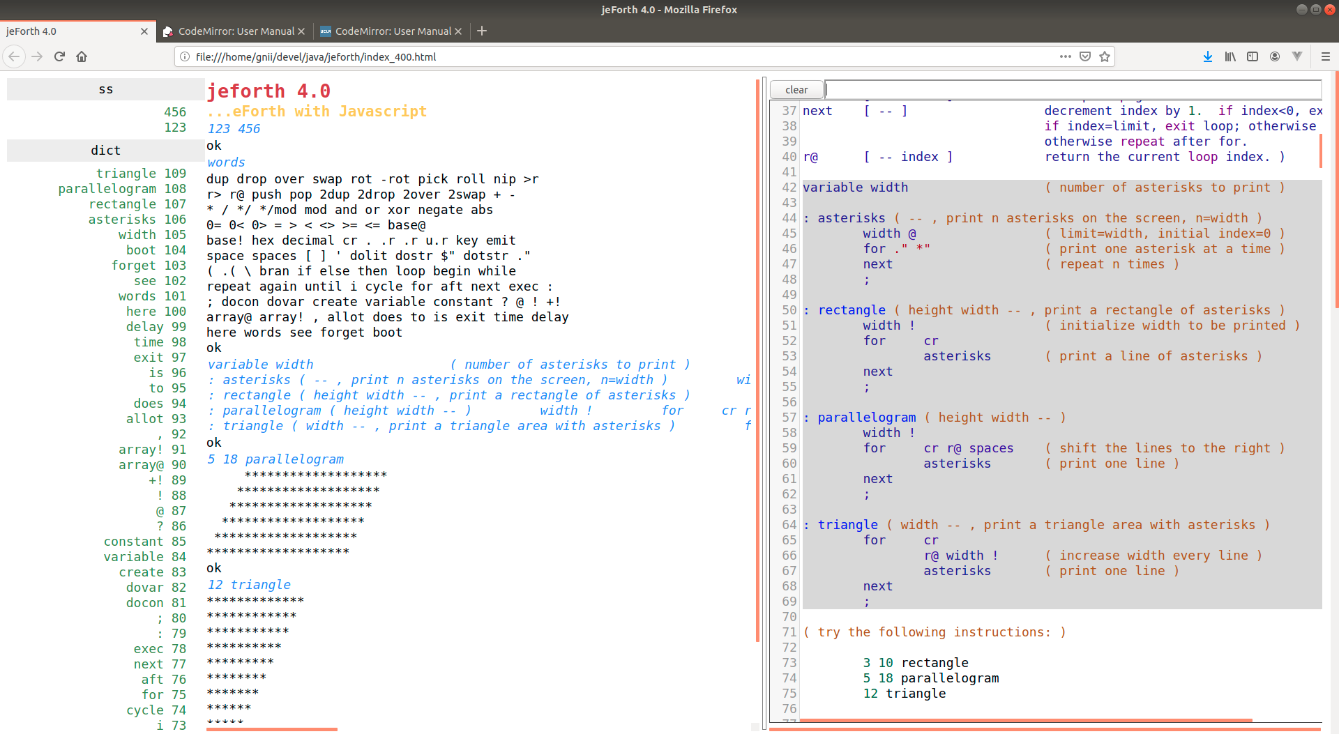 - jeforth by Cheah Shen Yap and Sam Chen, 2012, try jeforth_301 here