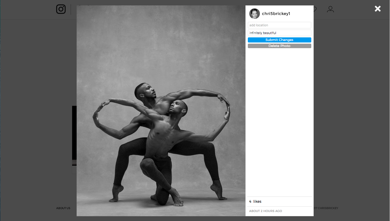 A graceful modal overlays each users profile page when one of their images is selected. It shows details of the post and allows the creator of a post to edit the details with instant update across the application.