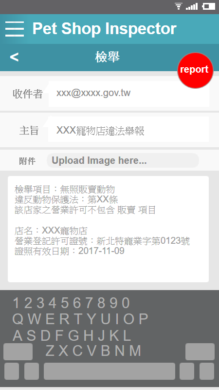 - User can click on the report button in any page to email authority of the petshop location with photos, description of violation and a template email we provided.