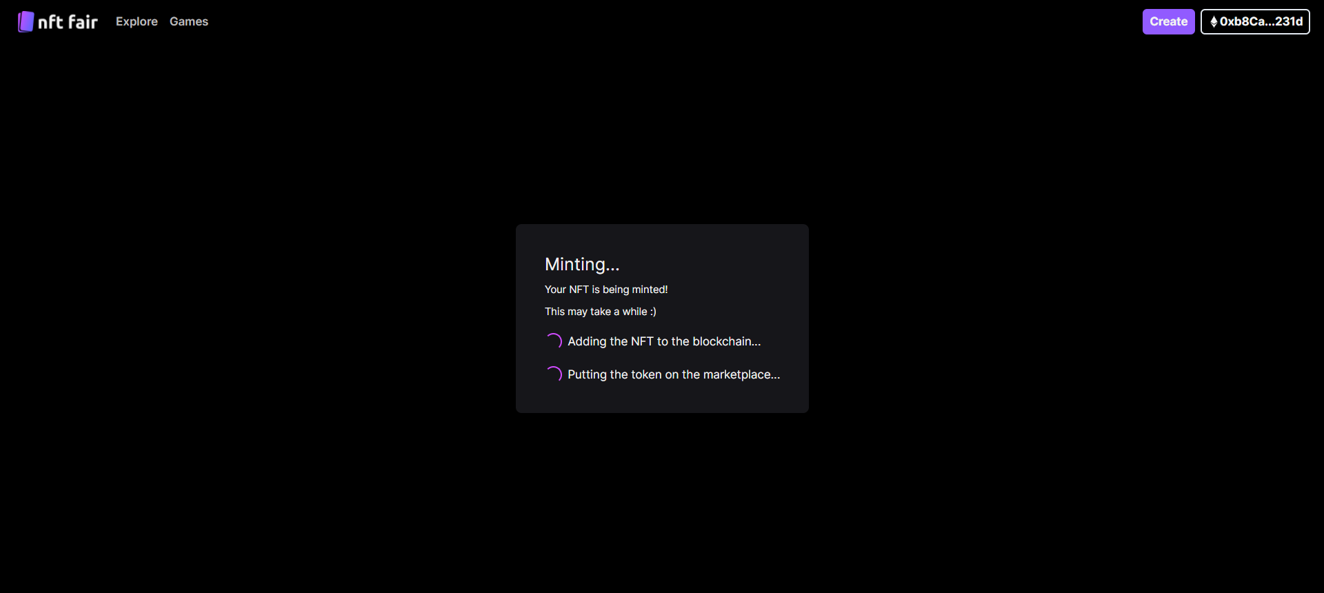 Really proud to present before you, NFT-Fair , a place to forget about the complexities of NFTs and just play around with them. Create, buy, sell, earn and even play with the NFTs. This is the one true stop shop for NFTs. Applause for the awesome people at thirdweb, whose product made this project possible.