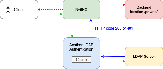 The following example shows how to configure Nginx that is running in the same machine as Another LDAP Authentication. The backend /private/