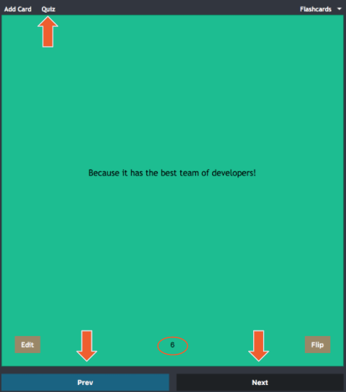 You can also use the Prev and Next buttons to cycle through the current list of flashcards. They are located at the bottom of the flashcards. In the top left corner, there is also a button called quiz, which will randomize the flashcards in the current list. This is a toggle, so you can toggle between a random order and an order of increasing index.