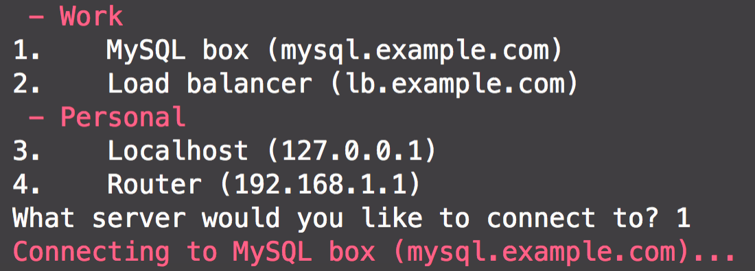 It works by reading ~/.sshconnect.json file containing a list of your servers. Upon running you're presented to that list and you're allowed to type your choice. sshconnect will execute ssh and replace itself with the newly created ssh process.