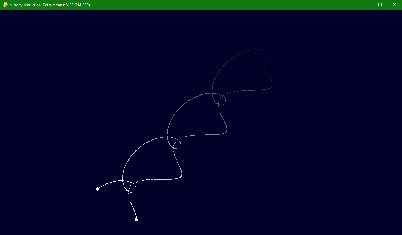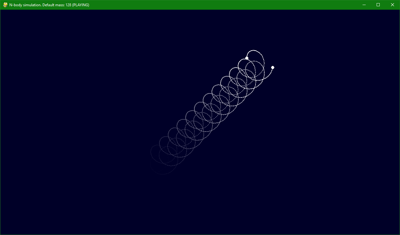 N-body simulation in pygame. Supports saving/loading, custom colours, click-drag to shoot, right click to remove masses. Save your own preferences in settings.json