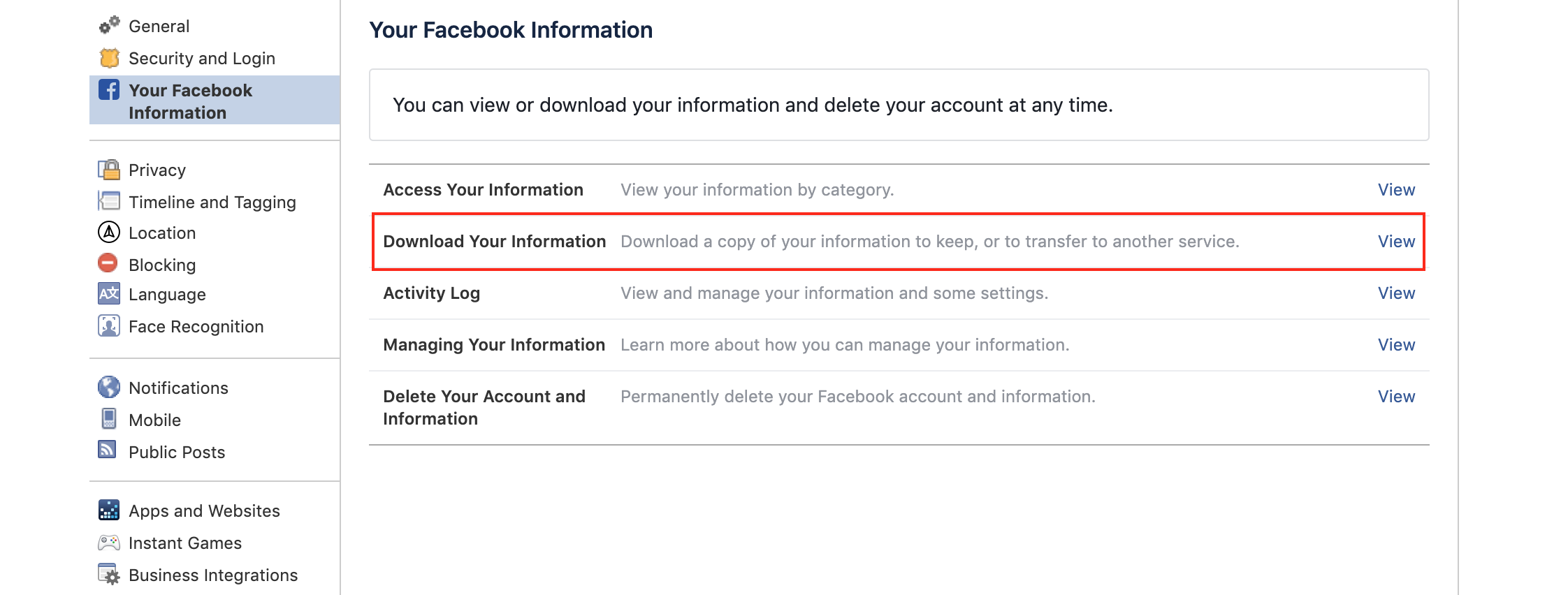pip install markovify - Download your facebook messenger chat info from Settings -> Your Facebook Information -> Download Your Information. Find detailed guidline with screenshots on how to download the messenger chat data from Facebook here.