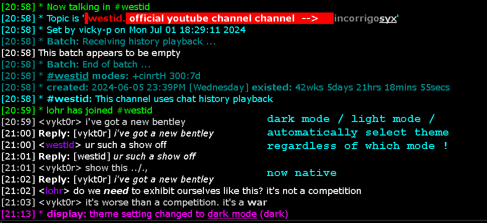 All of this is woven together with a visual design that, despite the limits of mIRC, manages to feel modern. Unicode glyphs, styled output, layered themes (including dark/light/auto detection), and even time-of-day sensitivity make this script feel alive. There is nothing generic about it. No part of it feels copied or adapted from some scripting archive of the past; because it isn't
