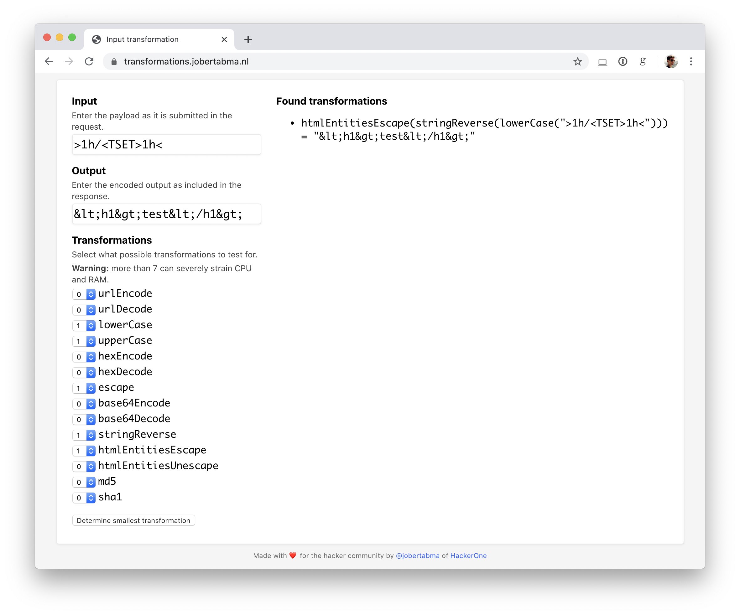 Example: if you notice that a server responds with c1aa46d751f1ffa58481418667134109ac5f573c when you give in test, this tool will immediately tell you that it’s stringReverse(sha1(md5(md5("test")))).