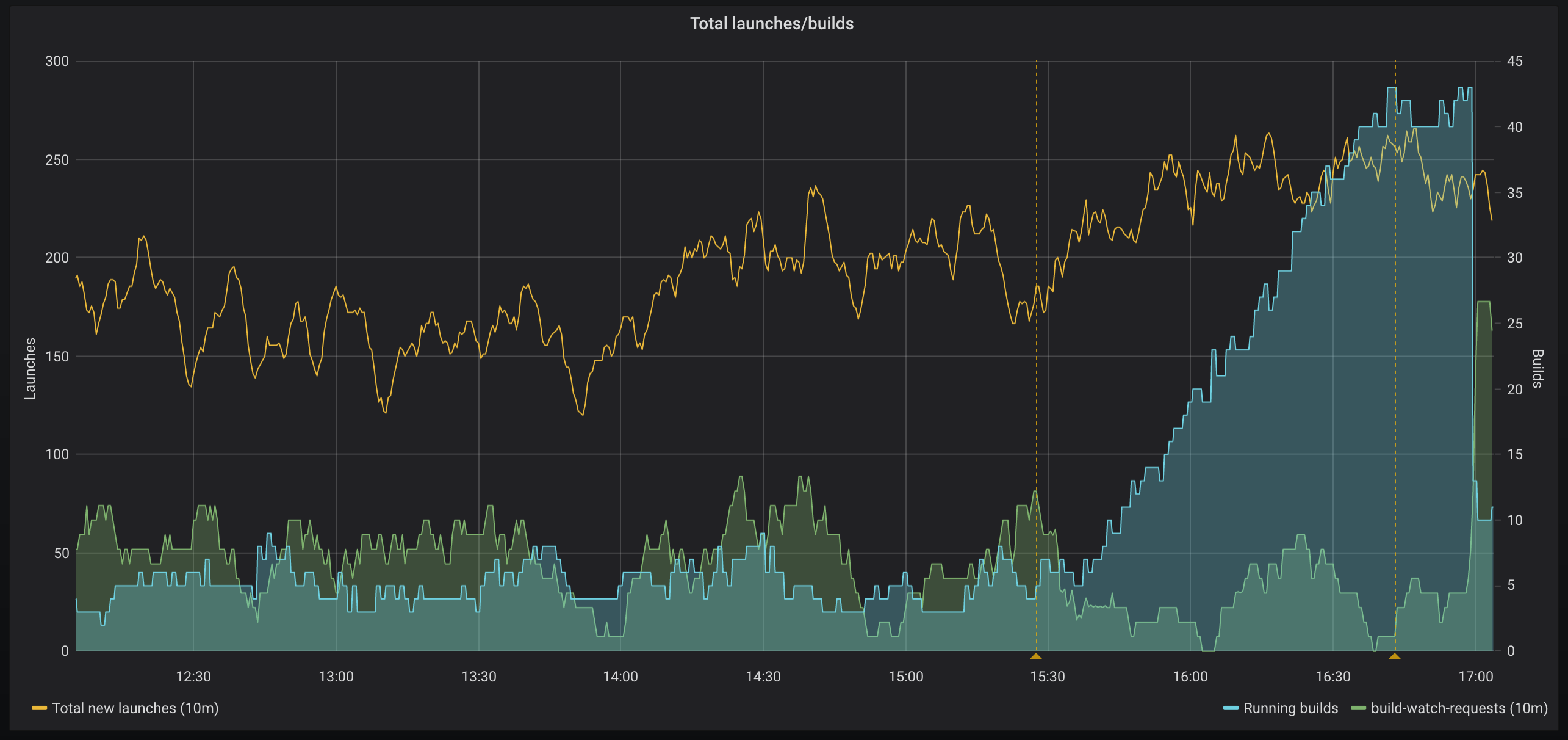 The marker just before 15:30h is the deploy. The blue shaded graph shows the number of "running" build requests ("running" includes "container creating"). At 17:00h I deleted all build pods and reverted the deploy.