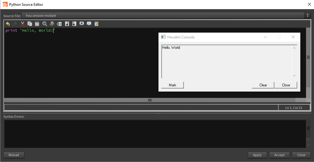 - Windows > Python Source Editor - Python editor which saves the code with *.hip file. Each time you open the file Python code in Source Editor will be executed. Best option to develop basic chanks of code and test their functionality. To use Python Scripts in all the scenes you need to save them to the Shelf and run from there.