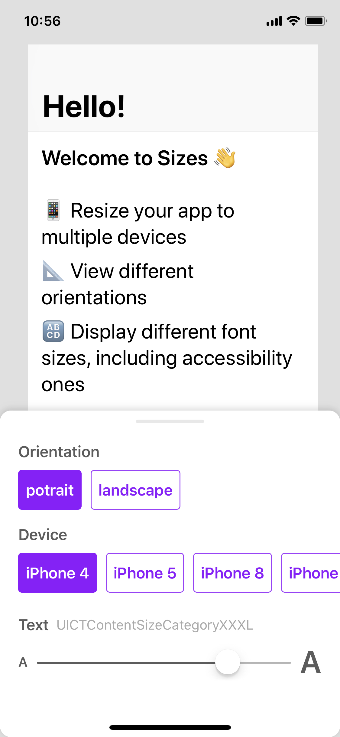 Sizes reduces the time it takes to evaluate all of our apps possible device sizes, orientations and font combinations. With Sizes we'll avoid launching all the supported devices simulator, running our app and navigating through each screen manually which not only takes a lot of time but its also highly error prone since we sometimes forget to test one particular combination and we ship a screen with a layout bug to the App Store.
