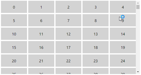 A simple layout component written using CSS Grid. Can be used to display a very large number of elements in a grid. This works by rendering only elements that are currently on the screen and a small portion before and after.