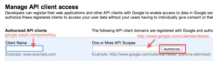 google.oauth.consumerKeyto the "Client ID" value listed under the "Client ID for web applications" section. - Set