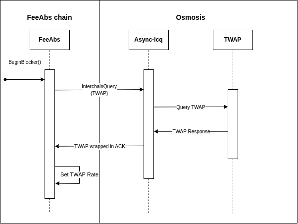 For every update exchange rate period, at fee-abs BeginBlocker() we submit a InterchainQueryPacketData which wrapped QueryArithmeticTwapToNowRequest to the querying channel on the customer chain's end. Then relayers will submit MsgReceivePacket so that our QueryTwapPacket which will be routed to async-icq module to be processed. async-icq module then unpack InterchainQueryPacketData and send query to TWAP module. The correspone response will be wrapped in the ibc acknowledgement. Relayers then submit MsgAcknowledgement to the customer chain so that the ibc acknowledgement is routed to fee-abs to be processed. Fee-abs then update exchange rate according to the Twap wrapped in the ibc acknowledgement.