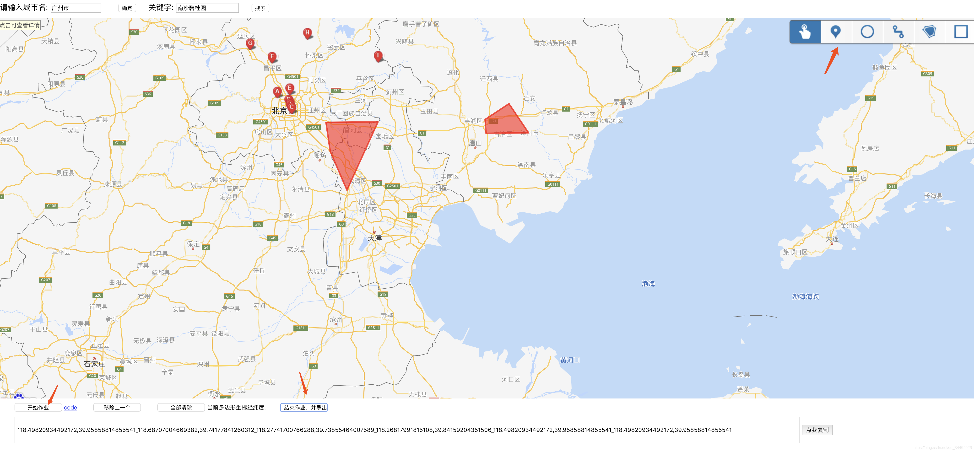 - 浏览器打开后,右上角可以搜索需要的城市以及POI名称,左上角是圈选工具拦,左下角是圈选的坐标展示区