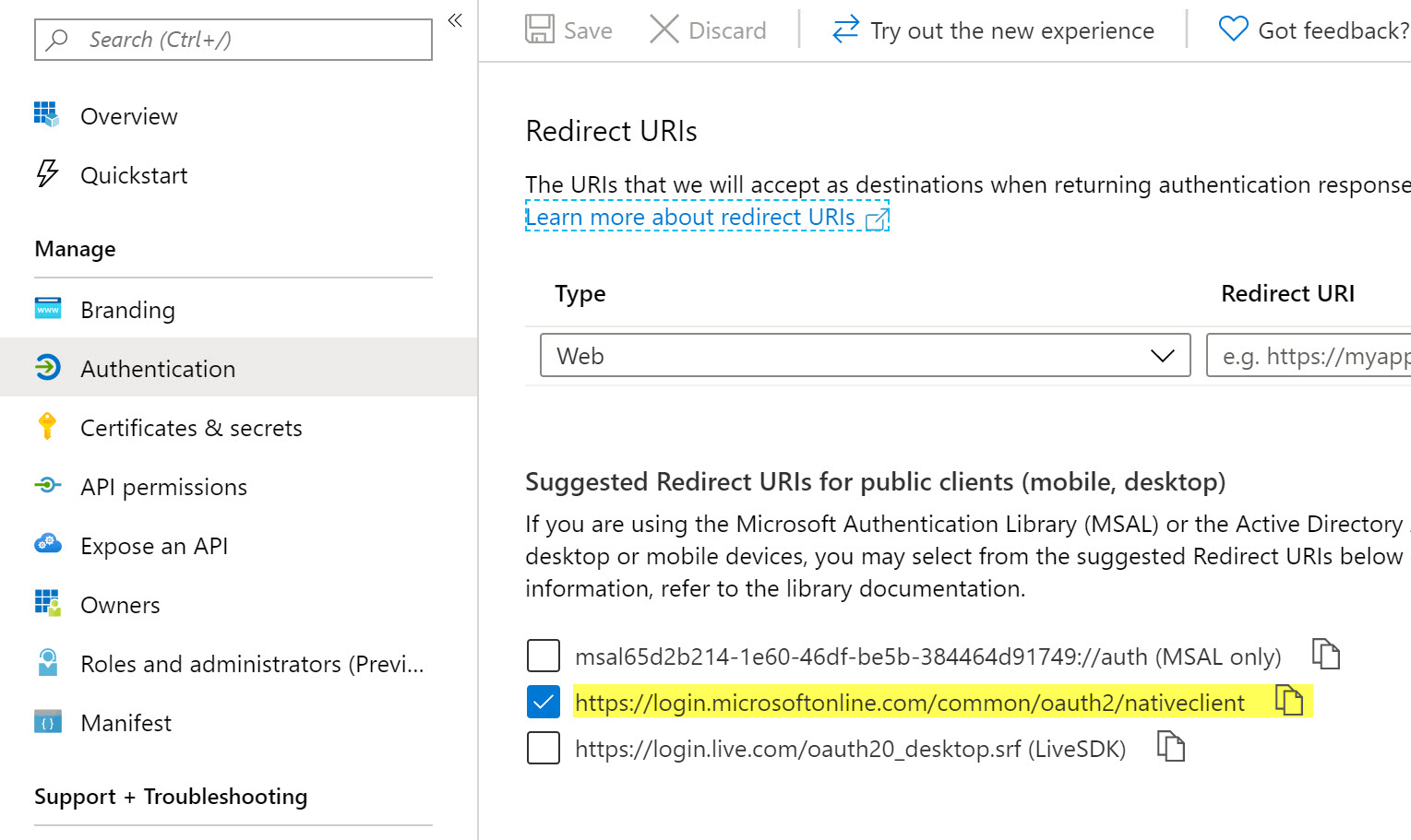 You can use the suggested reply URL for the native desktop client under Authentication