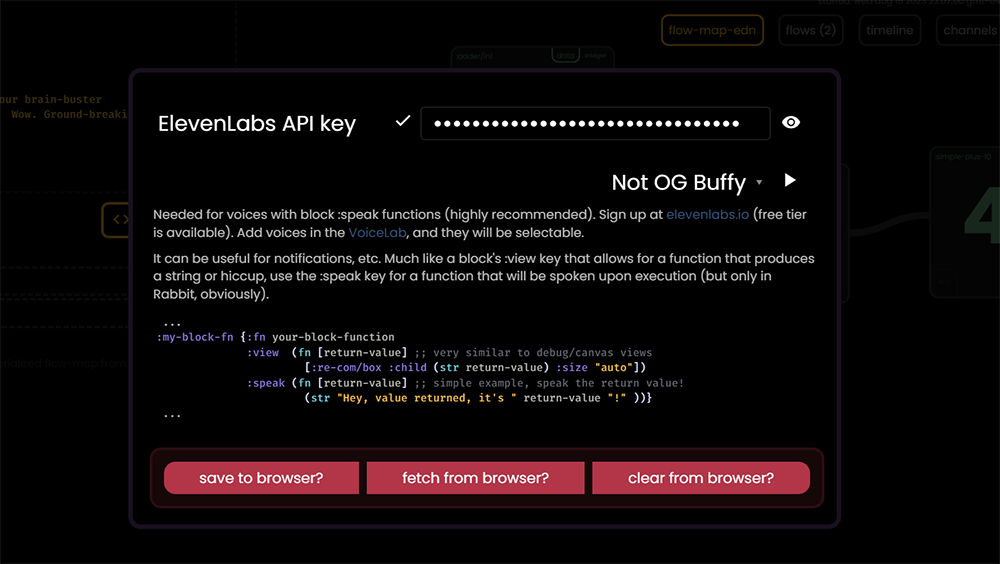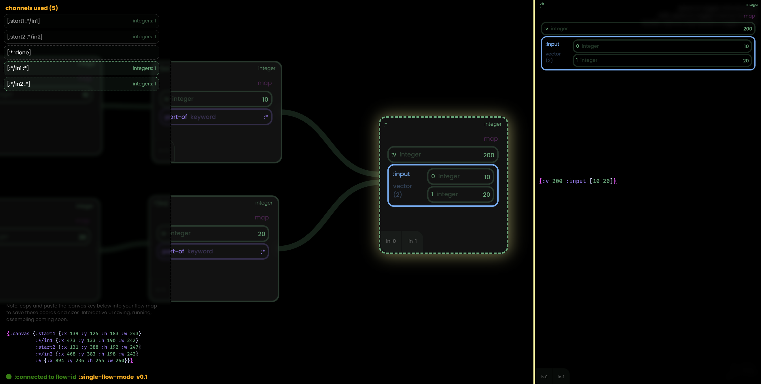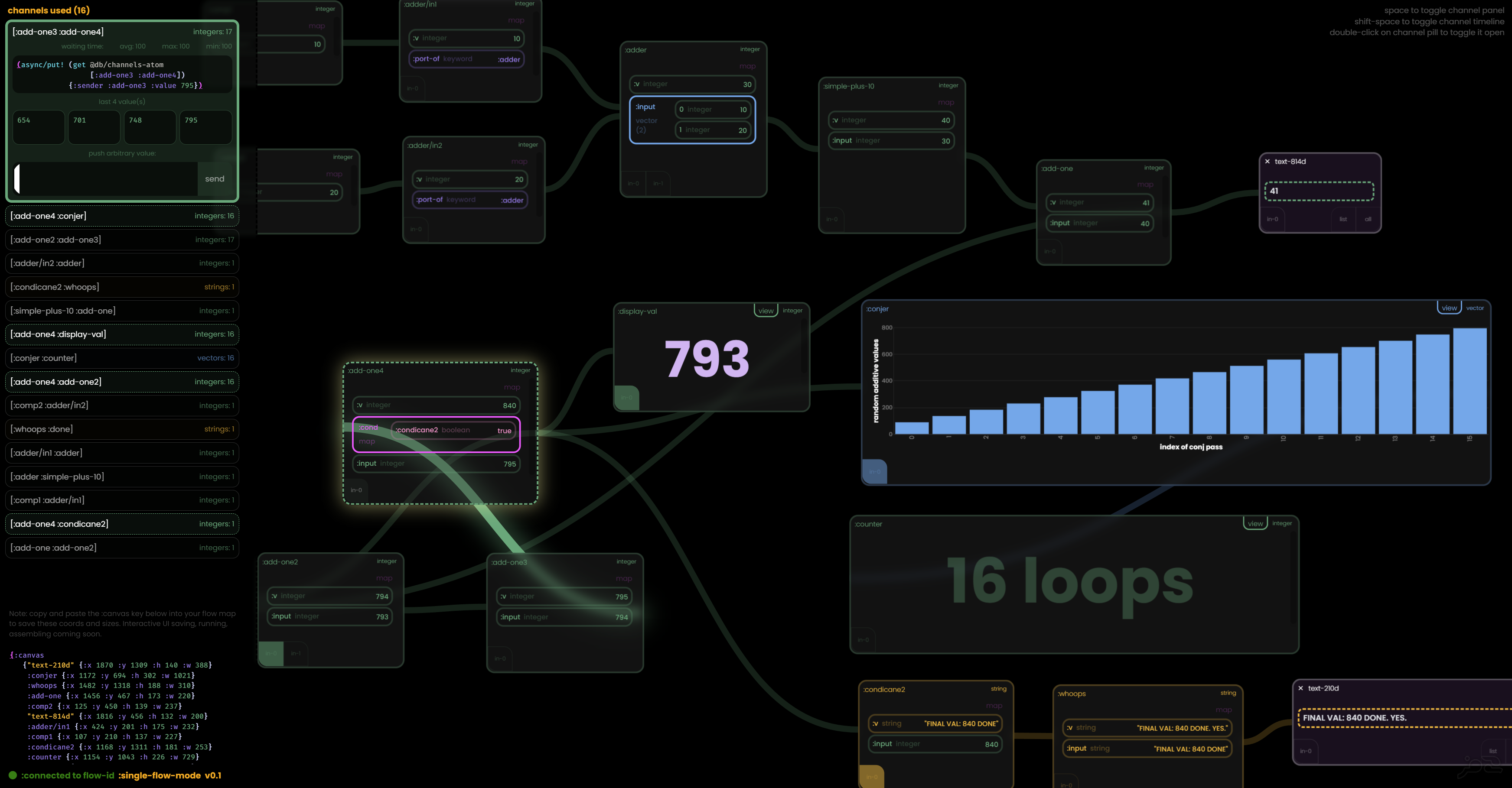 spec for flow-map data sent to the flow fn with useful errors:flow-id for each run to allow concurrent flows w/o clashing (will also fix a closing channel bug)- rabbit-ui will need to allow the user to choose which "loaded / running flow" to render and interact with (see "sub-flows" below)- :cljs-view option for ClojureScript views that get compiled on the front-end instead of the back end. Opens up some more interactivity options for view blocks.