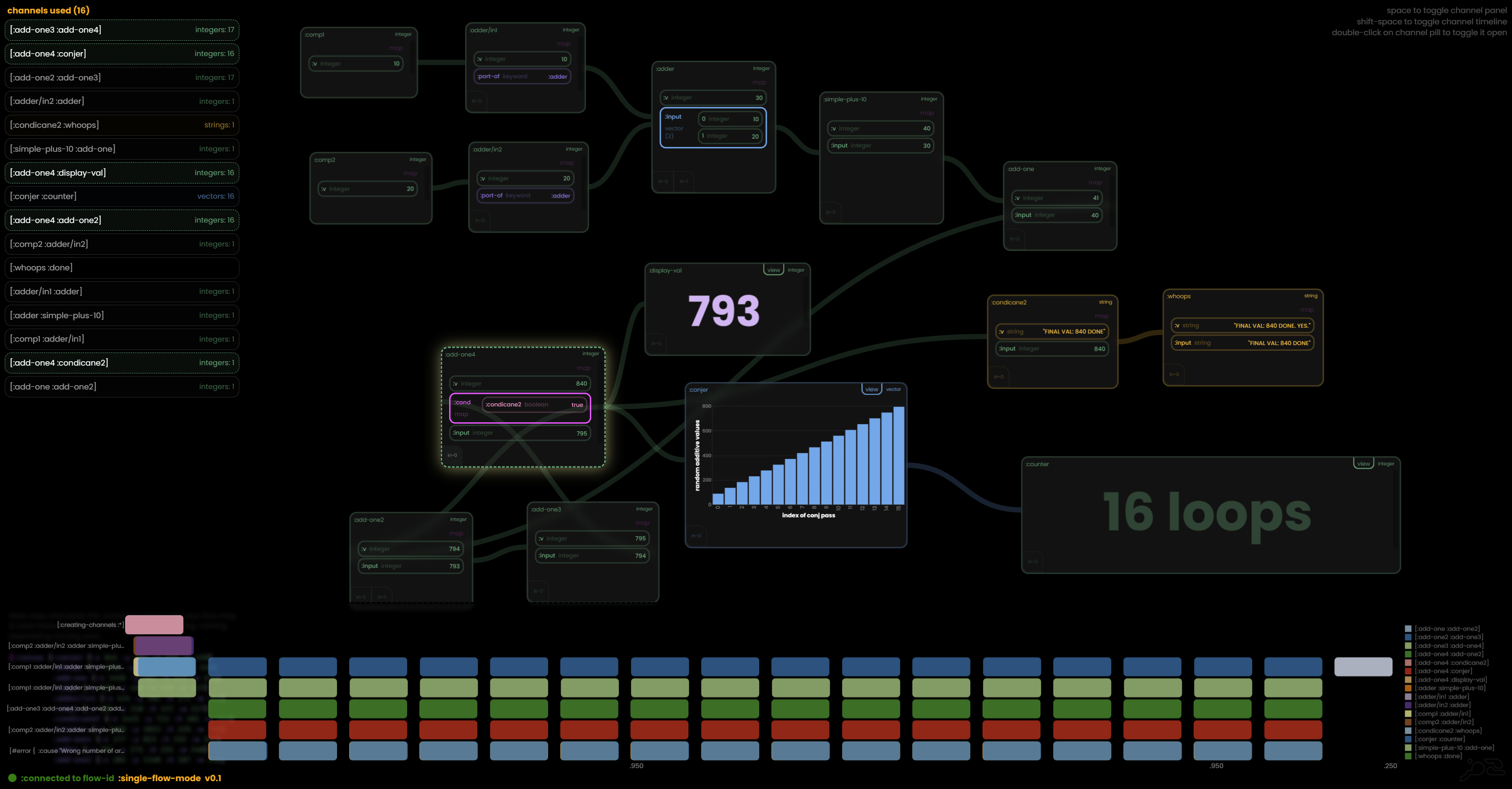 - the bottom timeline shows what channels and what functions ran, and we can scrub the blue line across time to see what the values were at that particular time. It's not quite illuminating in this simple example, but you can see how in complex flows with loops and conditional pathways how useful this can be.