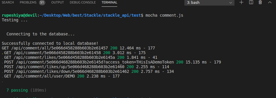Screenshot of comment routes tests