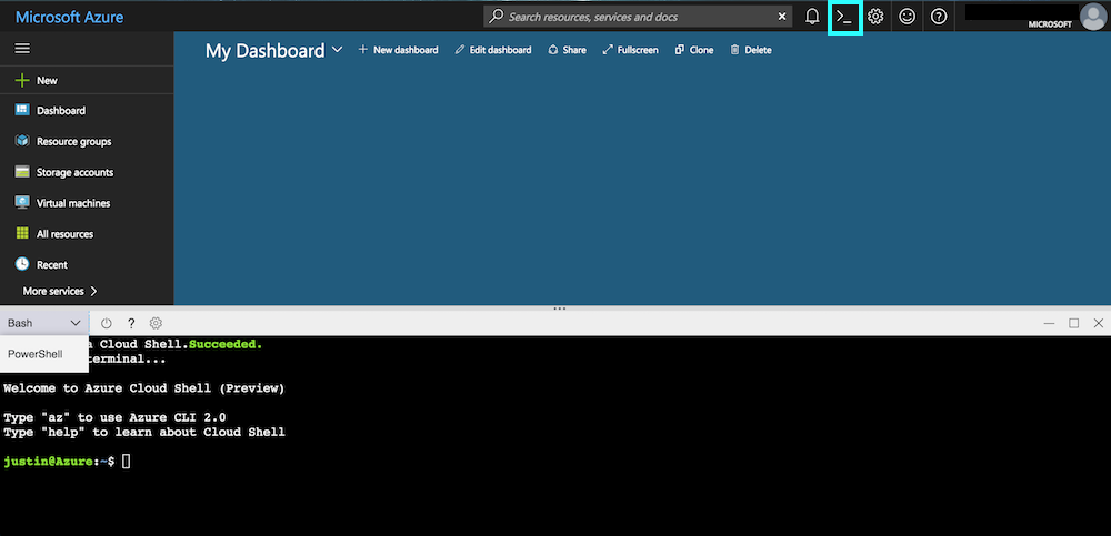 Navigate to the Azure Cloud Shell https://shell.azure.com and login if needed. You may also click the Cloud Shell Icon from the Azure Portal: