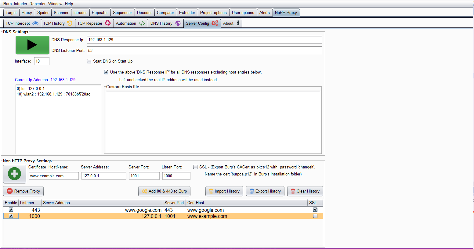 - A configurable DNS server. This will route all DNS requests to Burp or preconfigured hosts. It makes it easier to send mobile or thick client traffic to Burp. You need to create invisible proxy listeners in BurpSuite for the Burp to intercept HTTP traffic or you can use the second feature of this extension to intercept binary/non-http protocols.