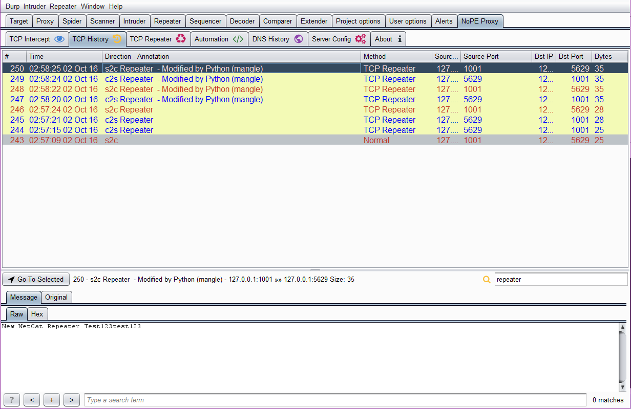 - TCP/UDP repeater can be used to replay requests to the client or server on the currently connected socket streams.