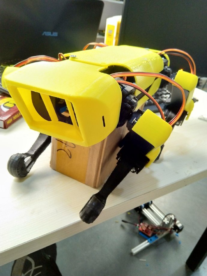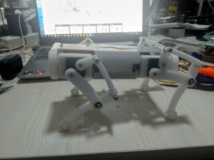 spotmicro来自于T站上的一个项目:https://www.thingiverse.com/thing:3445283 我为它写了一个简单的程序,基于arduino for stm32。包含了单腿运动学正反解、姿态自稳、简单步态等。其中步态死活调不好,应该是舵机性能太差(10来块模拟的996R)加上机器太重的原因。所以没有继续用这个结构。