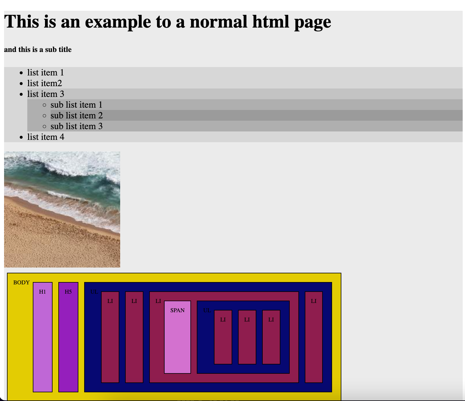 This is a JavaScript vanila module, that when added to an HTML page, It will display an inspector area at the bottom of the page. The inspector will feature a schematic view of the elements in the page, and allow highlighting of hovered elements and dragging them around to manipulate the DOM.
