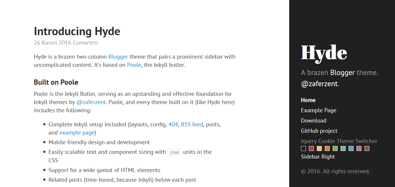 </div>Hyde ships with eight optional themes based on the base16 color scheme. Apply a theme to change the color scheme (mostly applies to sidebar and links).